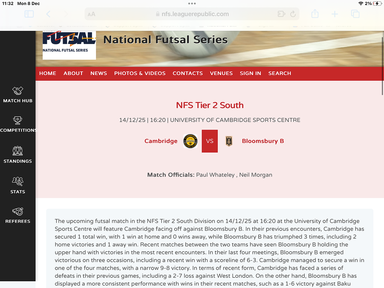 This Sunday (NB.later kick off than normal) sees Cambridge host at the University Sports Centre CB3 0AS a London Bloomsbury B team flying in the National Futsal Series T2S with some great recent results.
